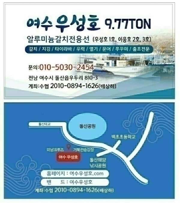 (덤으로 고등어 메탈120그램준비) ☆8월01일부터 ~12월말까지 갈치외줄 출조 예약받습니다☆ 미리 예약해서 일정 및 낚시준비도 하면 좋을듯합니다 모든낚시에 쿨러가득 잡으러 도전해 보실분 예약받습니다 ♡4월 출조 예약내용 입니다♡ === 여수 우성호 예약안내 === 예약문의 : 010-9778-2454 오시는길 : 여수시 돌산읍 돌산로 3617-38 홈페이지 : http://woosung.sunsang24.com/